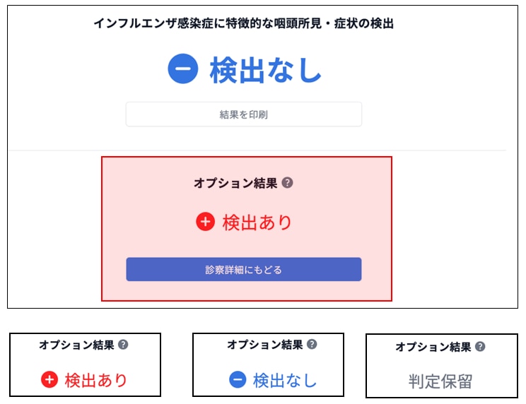 ※インフルエンザ判定と本機能は、使用目的や感度・特異度等の性能等が異なります。 また、それぞれの結果は独立した処理により出力され、互いに影響を与えることはありません。