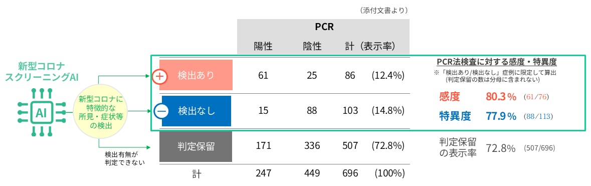 「検出あり・検出なし」に限定したPCR法検査に対する感度 80.3%、特異度77.9%、判定保留の表示率は72.8%です。